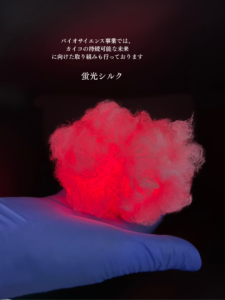 沖縄の海洋生物由来の蛍光タンパク質遺伝子を応用した本素材は、「光る」という新たな機能を持つ次世代シルクとして、幅広い分野での応用が期待されています。